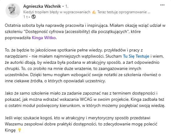 Nazywam się Kinga Witko i od 12 lat pracuję i prowadzę szkolenia w branży IT. Jestem certyfikowaną Testerką oprogramowania i Test Managerką, jako jedna z dziewięciu osób w Polsce posiadam też Certyfikat IAAP CPACC(Certified Professional in Accessibility Core Competencies), który potwierdza moje kompetencje jako praktyka dostępności.